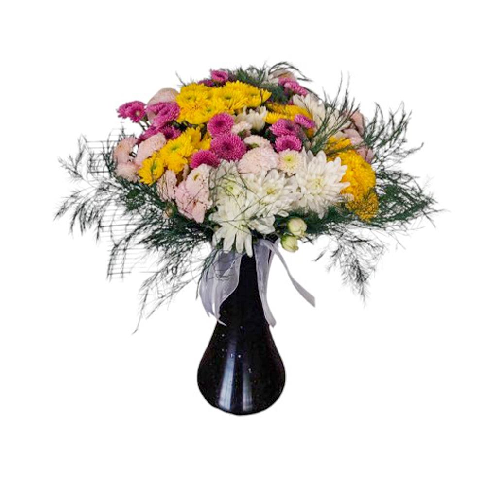 Şıklığı ve zarafeti bir araya getiren eşsiz bir çiçek düzenlemesidir. Siyah vazoya yerleştirilmiş rengarenk papatyalar, modern ve sofistike bir dokunuşla ortamınıza canlılık ve neşe katar. Papatyaların her biri, mutluluk, dostluk ve saflığı simgelerken, siyah vazo bu zarif çiçekleri öne çıkararak şık bir görünüm sağlar. Hem ev hem de ofis dekorasyonu için ideal olan bu buket, özel günler, kutlamalar veya sadece sevdiklerinize olan duygularınızı ifade etmek için mükemmel bir hediye seçeneğidir.